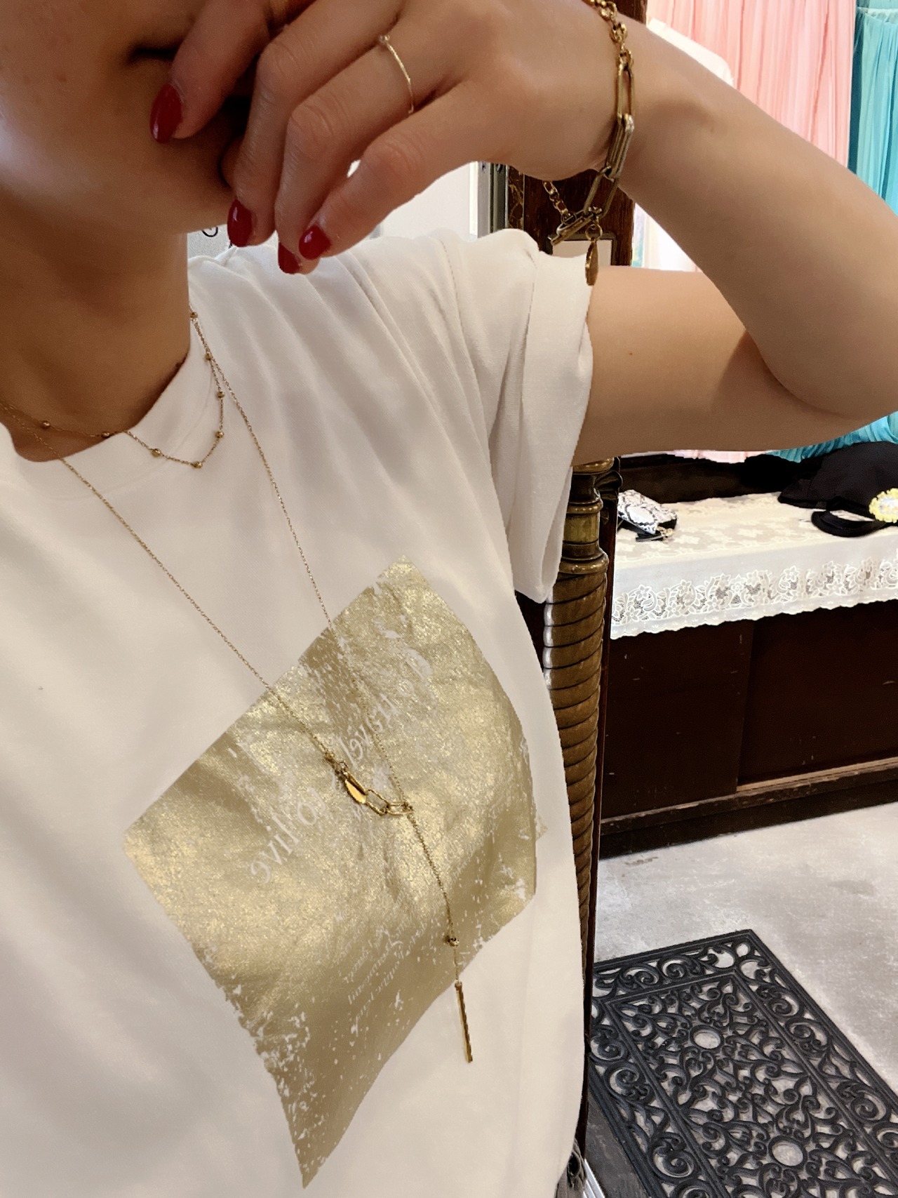 清潔感のあるホワイトに映える箔プリントが、大人の可愛さを引き立てるアイテムです。