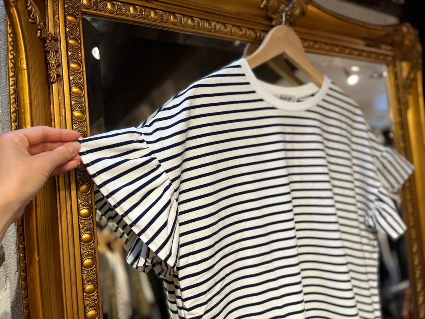 袖フリルボーダーカットソー/ネイビー